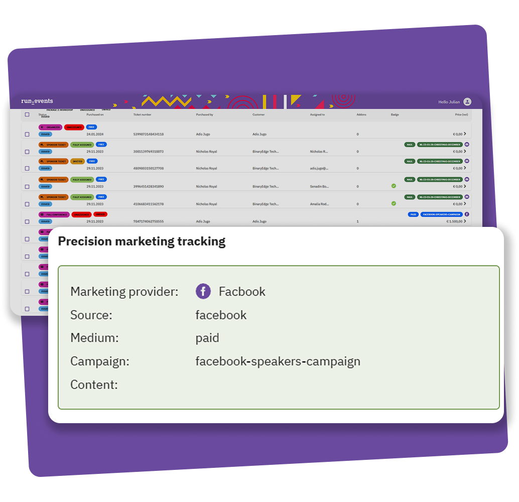 With our Precision Marketing Tracking, run.events tracks every ticket sale down to its source through integrated UTMs. Stop wondering what works and start making data-driven marketing decisions with a guaranteed ROI.